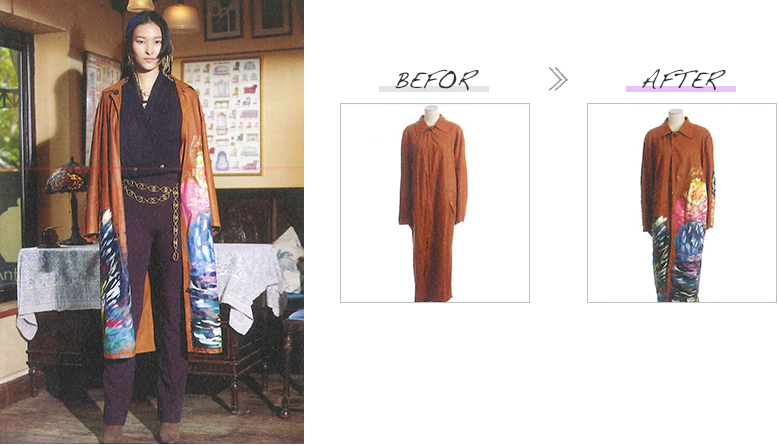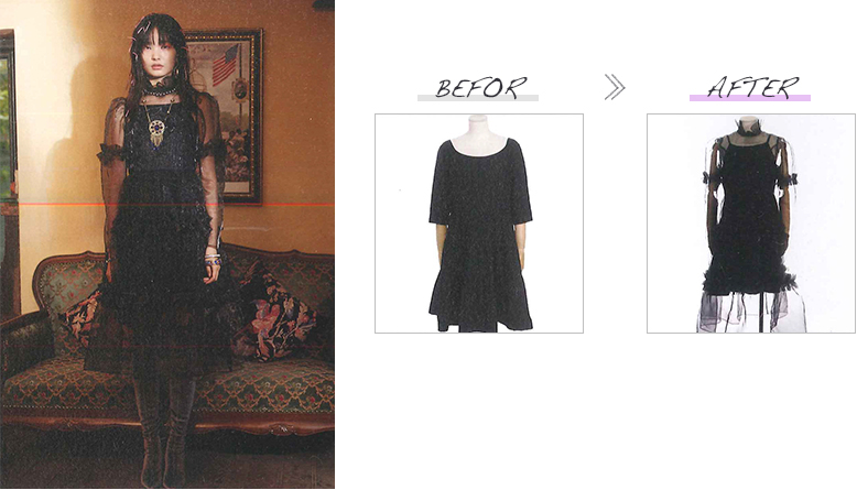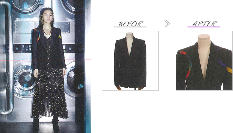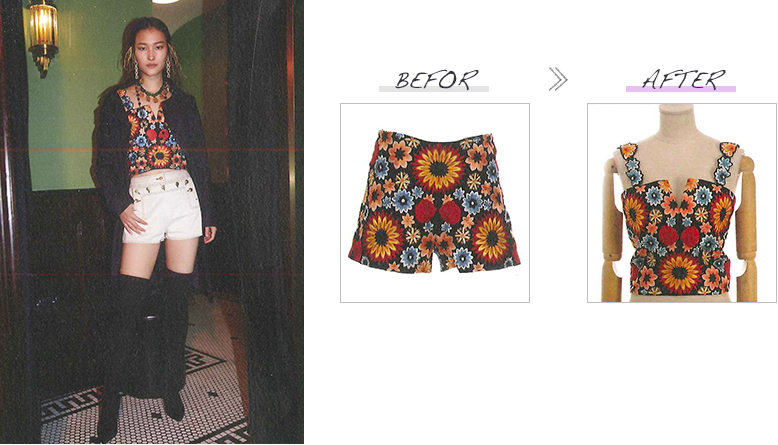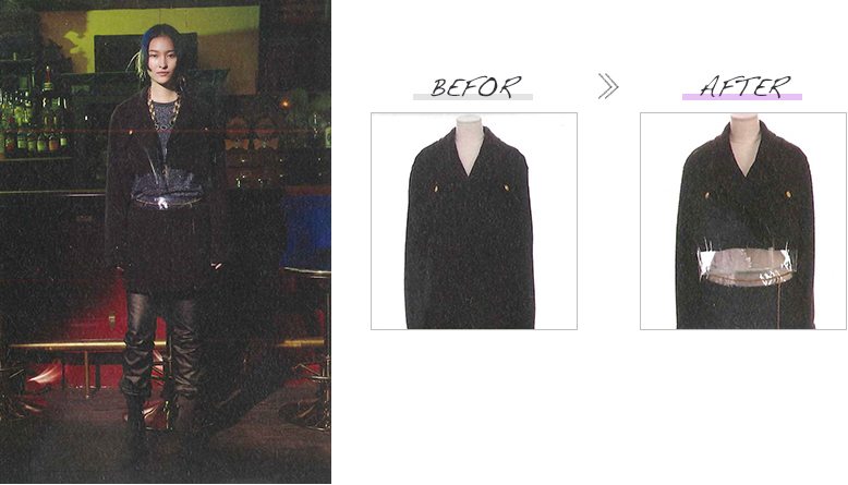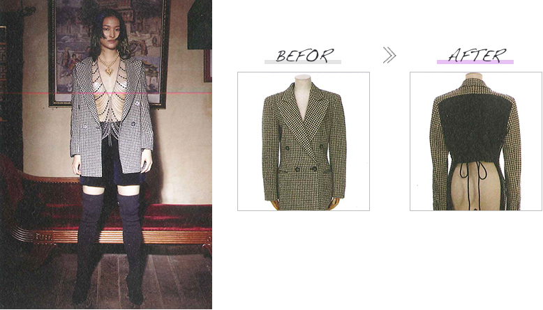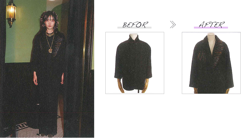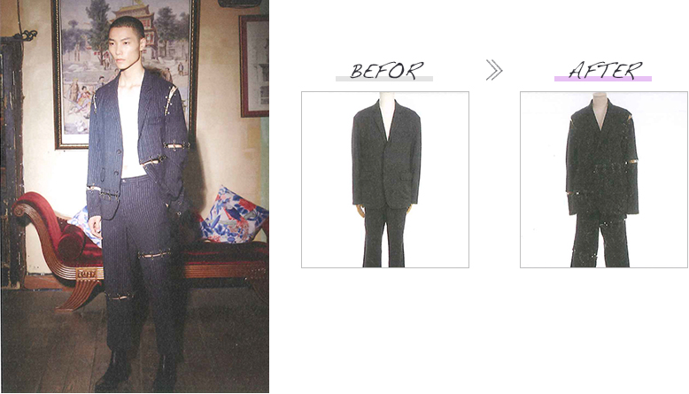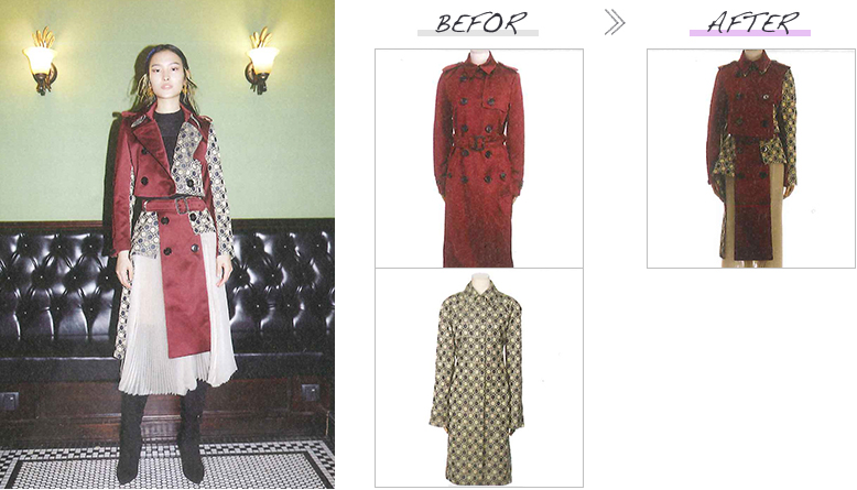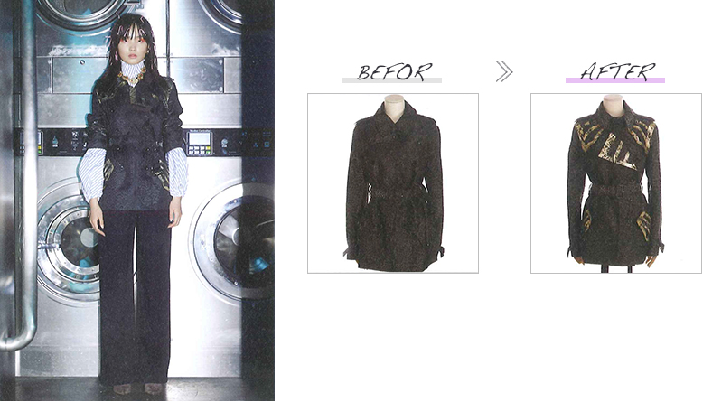このショーでは様々な分野で活躍する方々に、ベースとなるブランド服をセレクトいただくと共に、それをリデザインする理念を提示いただき、井上サチ子がそれを受けてリデザインしました。改作はすべて日本のアトリエの縫製技術を駆使して行われました。