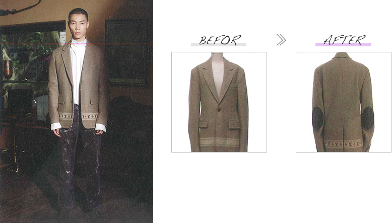 ハン・イー氏は「ファッション(この場合、物の資源として)の持続は、発展の生命力である」といわれ、今回のショーではMaison Martin Magielaの服をベースとして、不要になったものを生かして(この場合ルイ・ヴィトンのカバンを切り抜き肘宛にしています)おしゃれな服にと再生させました。