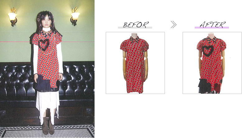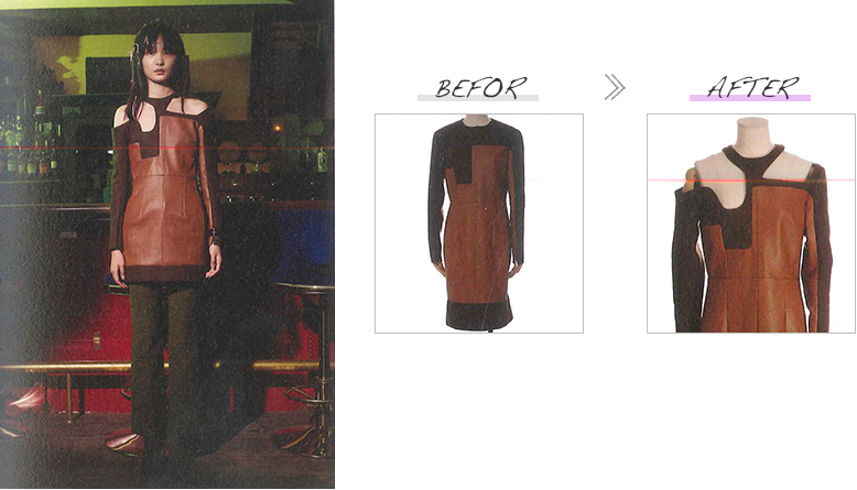 今回のショーでは「ファッション(限定された服)が持つ世界観をのこしながら、 新しい世界観を融合させ再び新しい命を与える」、というコンセプトをグロリアさんから提示され、Comme des Garconsのワンサイズの服をフリーサイズに出来るデザインに展開しました。